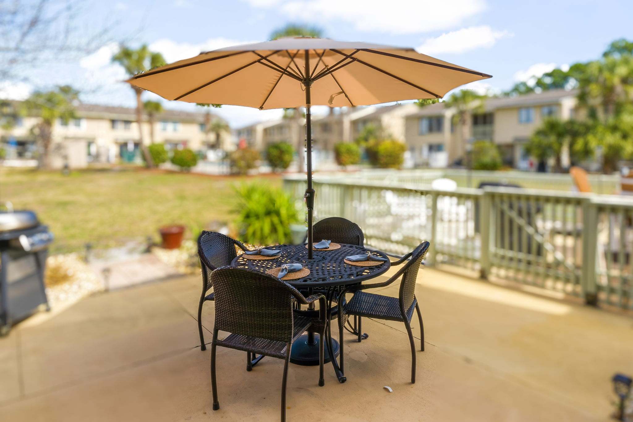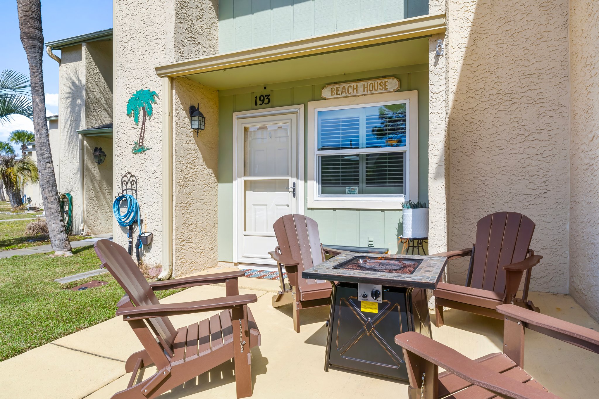Private patio with a flat-top grill and a front patio with a fire pit and Adirondack chairs.